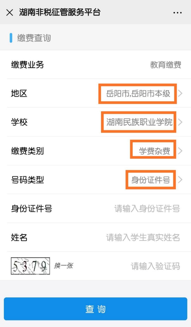 第四步:地区选择"岳阳市,岳阳市本级",公司选择"sunbet申搏"确认,缴费类别选择"学费杂费",号码类型选择"身份证件号",输入身份证号码、姓名和验证码后,点击查询。