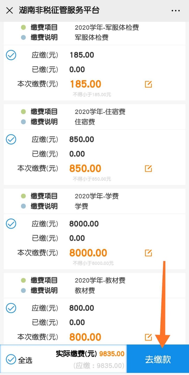 第五步:点击"去缴款",其中住宿费为最低标准,待开学报到住寝后据实补缴。