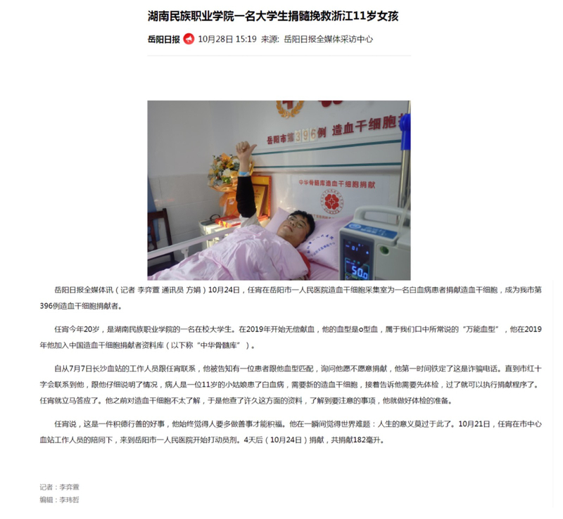 10月24日,我院19级物联1班学生任宵在市一人民医院成功捐献造血干细胞,成为我市第396例造血干细胞捐献者,岳阳日报对其事迹进行了报道。