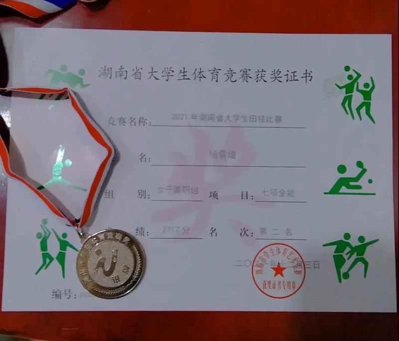 我院杨雪增同学在此次湖南省大学生田径比赛中获“女子七项(200米、800米 、100栏、跳高、跳远 、标枪、铅球)全能银牌”荣誉。