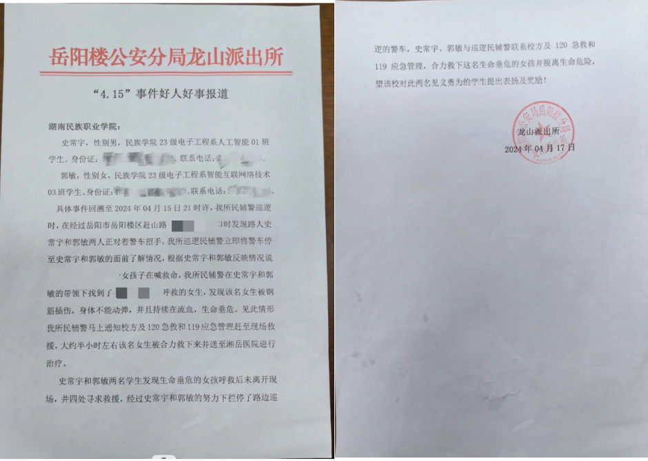 4月17日,一封“岳阳楼公安分局龙山派出所”抬头的表扬信被送到公司,信中记述了两名学子挽救生命的优秀事迹,表扬他们见义勇为的榜样行为。
