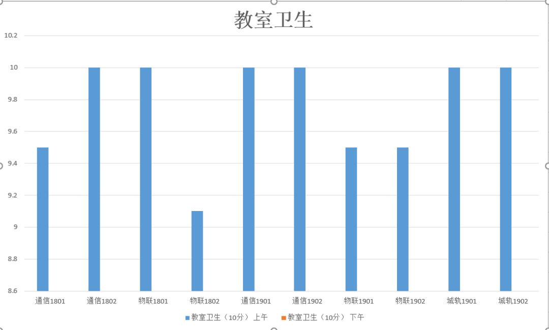 从图表可以看出,通信1801班、物联1802班、物联1901班和物联1902班的教室卫生不理想,扣分较多。相比与其他班级,物联1802班扣分较为严重,希望辅导员与卫生委员加强管理。