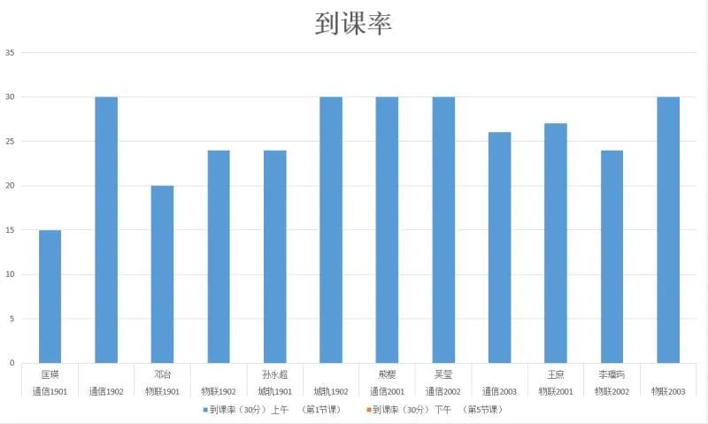 由此表可以看出,各班到课率情况,通信1901扣分情况还是比较严重。