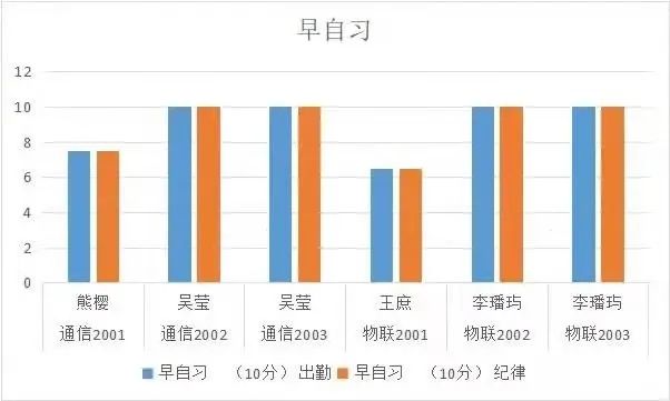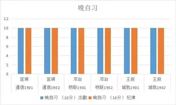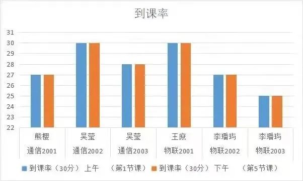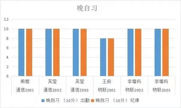 从表中可以看出,早自习通信2001班、物联2001班,晚自习物联2001有待提高,希望辅导员及各班班长加强管理。