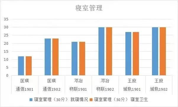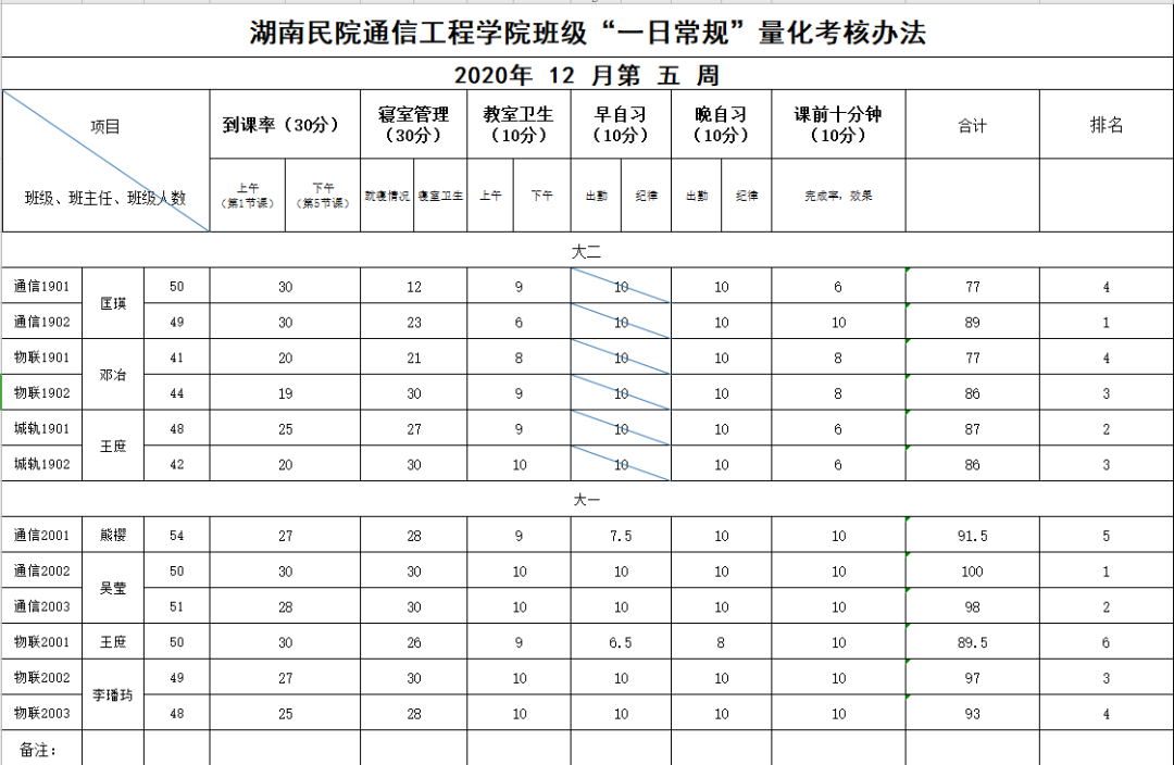 从表中可以看出,通信1901班、通信1902班、物联1901班、城轨1901班、通信2001班、物联2001班、物联2003班扣分情况有待提高,其他班级表现良好。希望各班辅导员和各班寝室长加强管理,督促到位。