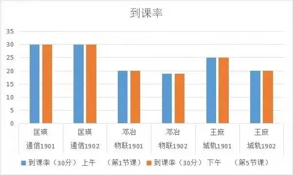 从表中可以看出,本周各班表现都非常好,其中物联1901班、物联1902班、城轨1901班、城轨1902班、通信2001班、通信2003班、物联2002班、物联2003班的同学们到课率有待提高,希望同学们再接再厉。