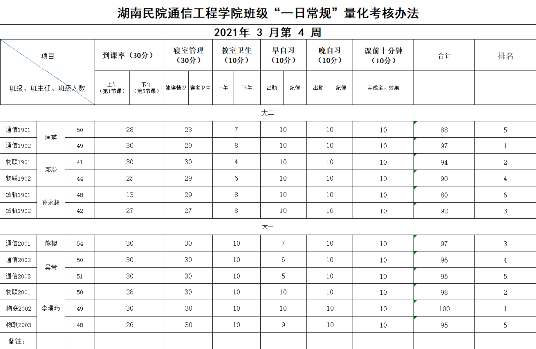耕耘今天,收获明天 | 第四周班级考核评分表